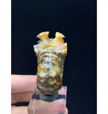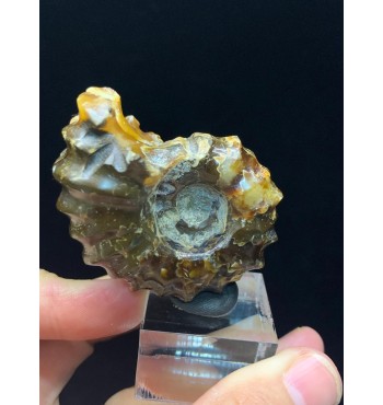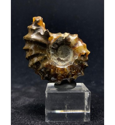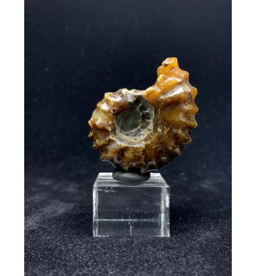 This is a polished Douvilleiceras ammonite from the Upper Cretaceous (112 million years old) of Madagascar. The fossil has been replaced with a beautiful yellow/amber colored agate and shows the distinctive bumpy shell of this ammonite genus. These polished Douvilleiceras ammonites are often referred to as "Jade Claw" ammonites.