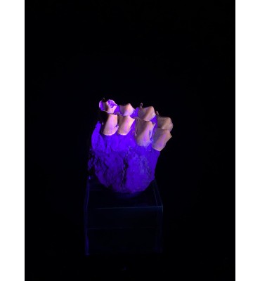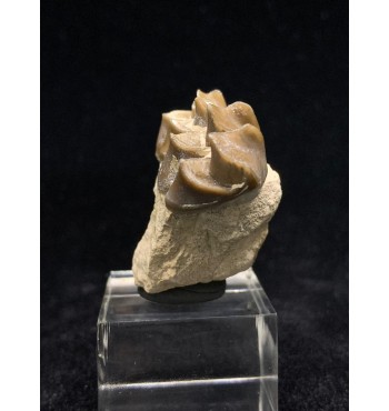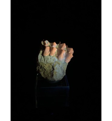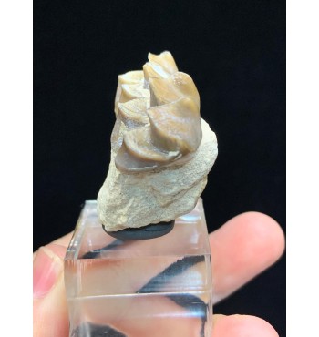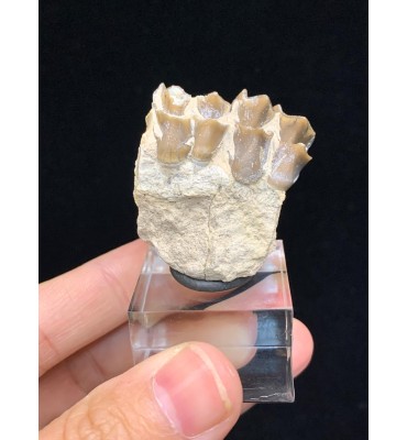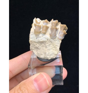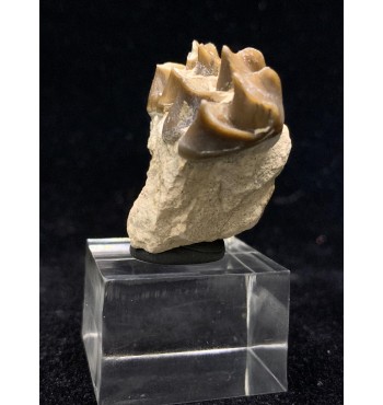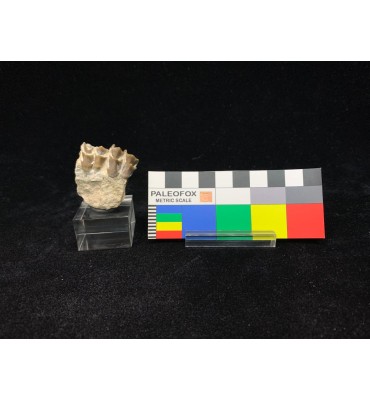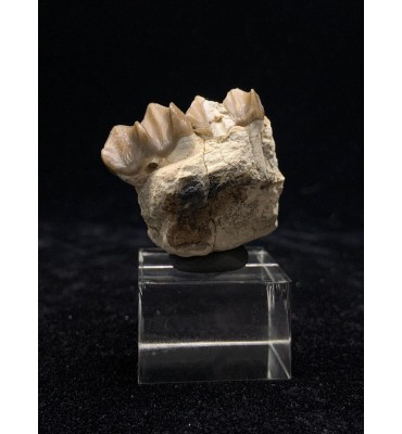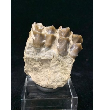 This specimen is composed of teeth still inserted in the jaw with dentin and intact roots, comes from the Brule Formation in South Dakota, about 32-34 million years old. Oreodonts are extinct mammals more closely related to camels and pigs, although they do not have close relatives living today. They were omnivorous animals with short faces and tusked fangs. With a similar size of a sheep. They roamed the plains of North America in packs of many specimens during the Oligocene period. Fossil accompanied by label and plastic box
