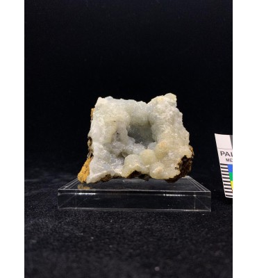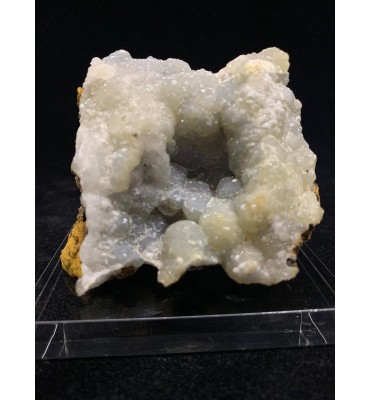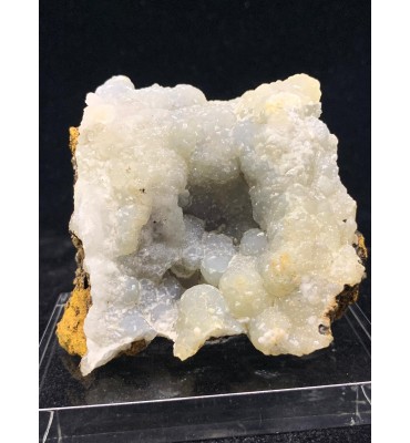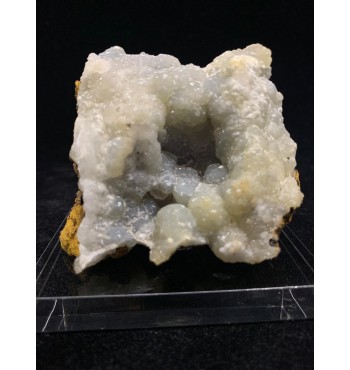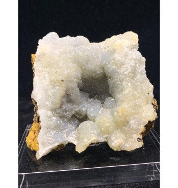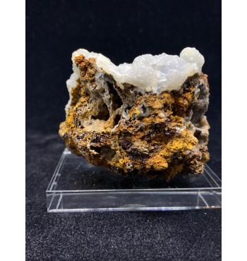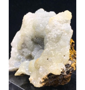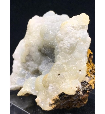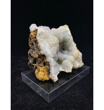 Beautiful specimen of blue-white smithsonite with a characteristic pearly and botryoidal habit. The globular aggregates develop abundantly, creating an undulating and luminous surface that catches the light with great elegance. The matrix consists of brown goethite, which provides a pleasant chromatic contrast with the pale smithsonite.