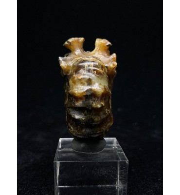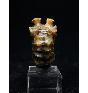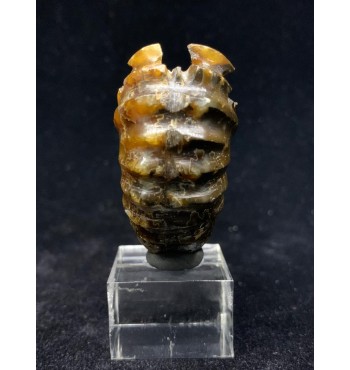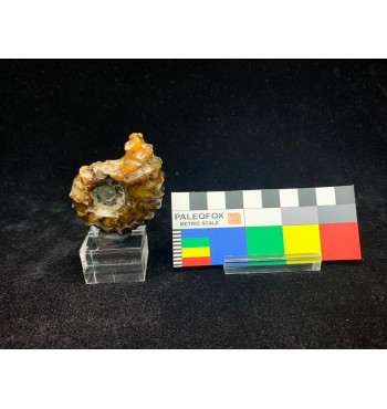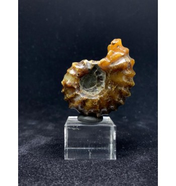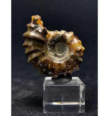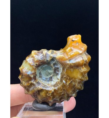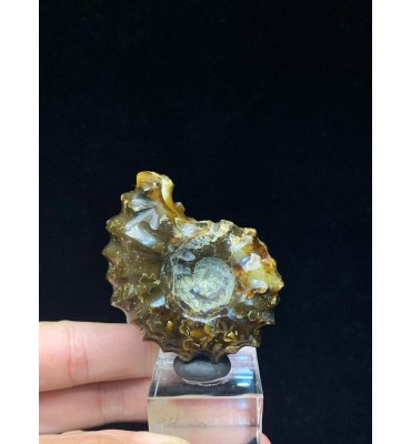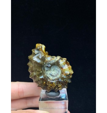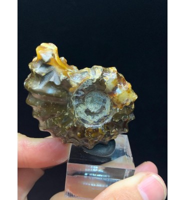 Si tratta di un'ammonite di Douvilleiceras lucidata risalente al Cretaceo superiore (112 milioni di anni fa) del Madagascar. Il fossile è stato sostituito con una splendida agata color giallo/ambra e mostra il caratteristico guscio bitorzoluto di questo genere di ammoniti. Queste ammoniti di Douvilleiceras lucidate sono spesso chiamate ammoniti "artiglio di giada".