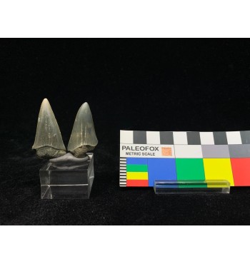 Un bel lotto di 2 denti di Carcharodon hastalis (Agassiz,1843). Denti provenienti dalla sabbie di Anversa risalenti al Miocene/Pliocene