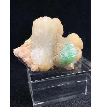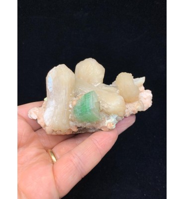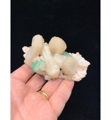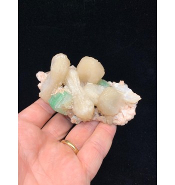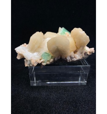 Elegante campione di apofillite verde associata a cristalli di stilbite dorata, presentati su matrice basaltica di colore scuro. I cristalli di apofillite mostrano la tipica colorazione verde acqua con lucentezza madreperlacea, mentre le stilbiti formano aggregati tabulari a ventaglio di tonalità giallo-crema. Un'associazione mineralogica classica delle formazioni basaltiche trappeane, ideale per collezionisti e didattica universitaria.