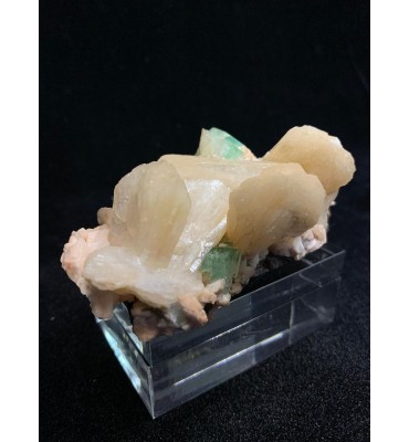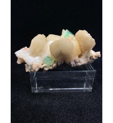 Un elegante campione che riunisce tre specie mineralogiche in perfetta associazione naturale: cristalli di apofillite verde dal caratteristico colore acquamarina e lucentezza madreperlacea, aggregati tabulari a ventaglio di stilbite dorata in tonalità giallo-crema, il tutto impiantato su una densa matrice basaltica di colore scuro.