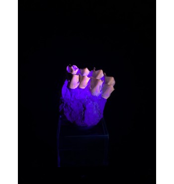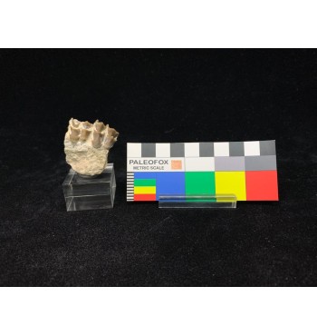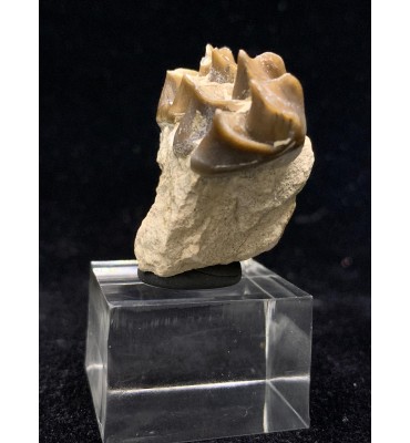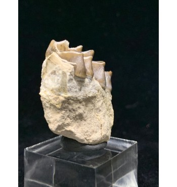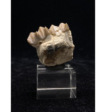 Esemplare composto da denti ancora inseriti nella mandibola con dentina e radici intatte, proveniente dalla Brule Formation nel Sud Dakota, circa 32-34 milioni di anni. Gli Oreodonti sono mammiferi estinti più strettamente correlati a cammelli e maiali, sebbene non abbiano parenti stretti che vivono oggi. Erano animali onnivorii con facce corte e denti canini simili a zanne. Con una dimensione simile a quella di una pecora. Vagavano per le pianure del Nord America in branchi composti da molti esemplari durante il periodo dell'Oligocene.