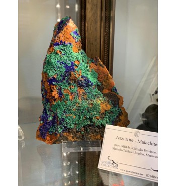 Azzurrite Cu3(Co3OH)2CLASSE MINERALOGICA: carbonato GRUPPO: trimetrico SISTEMA: monoclino (2/m) ABITO: i cristalli sono prismatici allungati o aghiformi (con disposizione raggiata); molte volte si presenta in masse microcristalline compatte o terrose. Spesso è associata a malachite, minerale in cui si altera DUREZZA: 3,5-4 PESO SPECIFICO: 3,7-3,9 INDICE DI RIFRAZIONE: na=1,730 nb=1,758 ng=1,836 (birifrangente) COLORE: blu scuro nei cristalli, azzurro nelle masse terrose LUCENTEZZA: vitrea TRASPARENZA: da semitrasparente ad opaca SFALDATURA: distinta lungo una direzione, debole nelle altre STRISCIO: polvere blu chiara FRATTURA: concoide e fragile GENESI: si forma con la malachite per alterazione all'aria di tutti i minerali di rame PLEOCROISMO: intenso in vari toni del blu Malachite Cu2(OH)2CO3CLASSE MINERALOGICA: carbonato GRUPPO: trimetrico SISTEMA: monoclino (2/m) ABITO: è quasi sempre microcristallina (strato d'alterazione dei minerali di rame), ma si trova anche sotto forma di strati fibrosi, in ammassi reniformi o efflorescenti. In alcune cavità può essere raramente rinvenuta malachite in piccoli cristalli aghiformi DUREZZA: 4 PESO SPECIFICO: 4,0 INDICE DI RIFRAZIONE: n=1,85 (indice medio) (birifrangente) COLORE: dal verde al verde scuro LUCENTEZZA: da vitrea a sericea TRASPARENZA: opaca SFALDATURA: distinta in una direzione ma raramente visibile STRISCIO: polvere verde FRATTURA: da concoide a scheggiosa GENESI: l'ambiente genetico della malachite è quello dei solfuri primari di rame, dove si rinviene superficialmente come prodotto d'alterazione PLEOCROISMO: assente