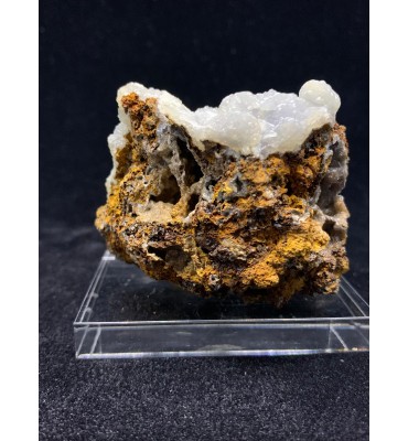 Smithsonite bianco-bluastra dal caratteristico aspetto perlaceo è dispersa e tappezza le cavità nella goethite bruna.