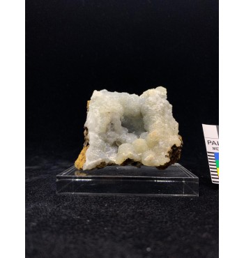 Splendido esemplare di smithsonite bianco-bluastra con caratteristico aspetto perlaceo e botroidale. Le aggregazioni globulari si sviluppano in modo rigoglioso, creando una superficie ondulata e luminosa che cattura la luce con grande eleganza. La matrice è costituita da goethite bruna, che offre un piacevole contrasto cromatico con la smithsonite chiara.
