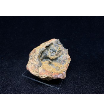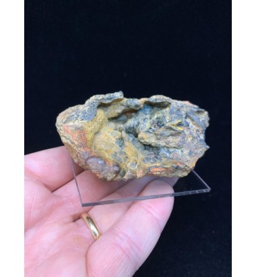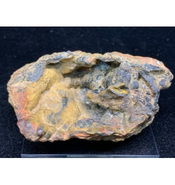 La superficie si presenta con caratteristiche forme a grappolo (botroidali), rivestite da una patina ocracea calda che vira verso tonalità ruggine e grigio-nerastro. La struttura è ricca, tridimensionale, con piccoli noduli e creste che ne esaltano il carattere minerale autentico.